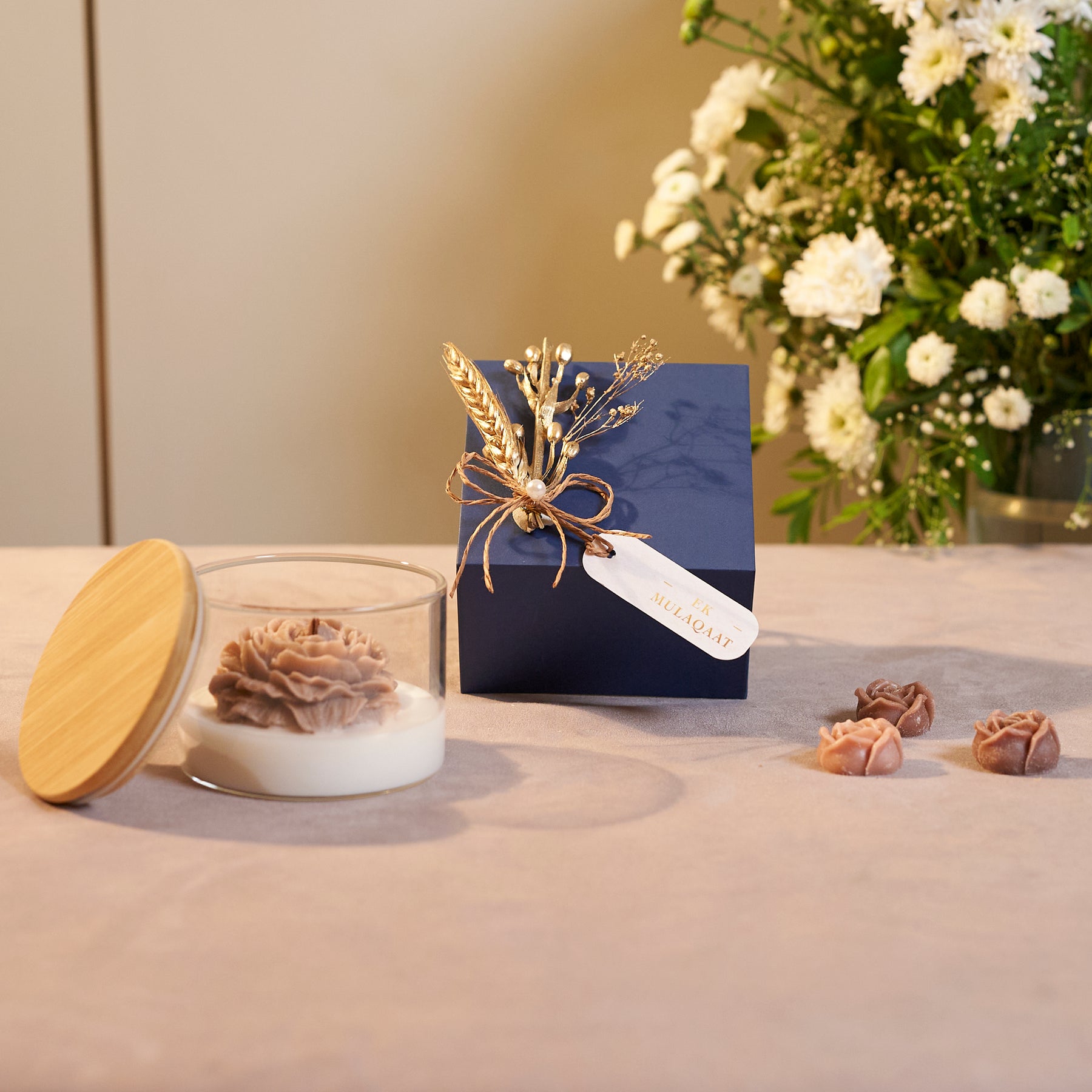 Beautifully packed in a gift box adorned with golden florals and a hand-tied raffia bow.
