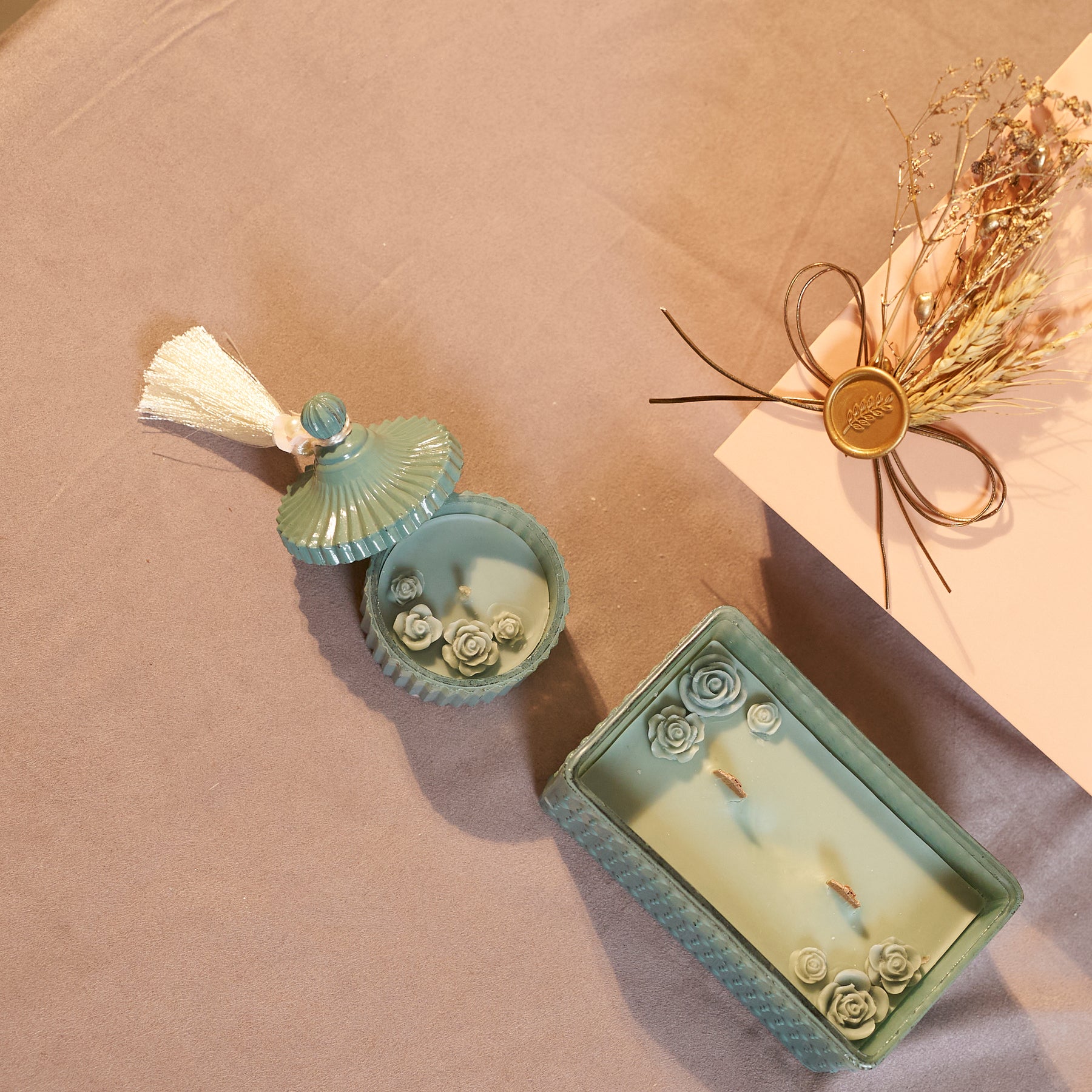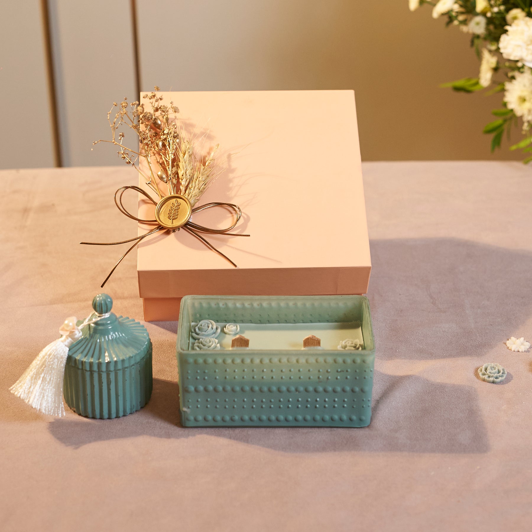 Elevate your gifting with this elegant teal blue candle gift set, housed in a beautifully textured glass jar and presented in a blush-toned box — adorned with a hand-tied bow, personalized seal stamp, and dried florals.